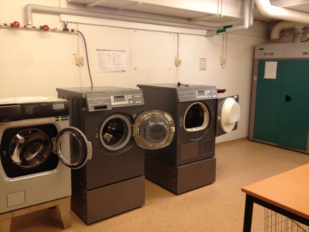 De vanliga tvättstugorna innehåller två tvättmaskiner, en torktumlare, ett torkskåp och en kallmangel.